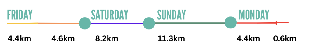 - Average daily swimming = expect to swim between 4 to 11km per day on event days - see itinerary for a guide (these distances are less for those wishing to enter the 22.2 or 11.1)
